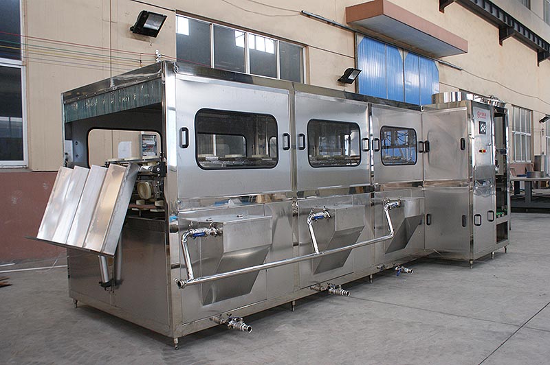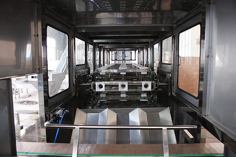 3.本灌裝設(shè)備集自動(dòng)拔蓋、洗桶、自動(dòng)上桶、內(nèi)沖洗系統(tǒng)、灌裝、風(fēng)送蓋、套蓋、壓蓋、熱收縮膜、直線式提桶機(jī)及成品輸送于一體,整個(gè)生產(chǎn)過程都有采用封閉式運(yùn)行,加上紫外線殺菌。臭氧消毒,保證了整個(gè)洗瓶灌裝過程完全達(dá)到國家衛(wèi)生部門的有關(guān)標(biāo)準(zhǔn)和規(guī)定,有效防止了飲用水在灌裝過程中可能發(fā)生的二次污染,做到無菌生產(chǎn)。