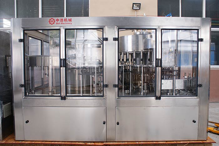 三合一礦泉水灌裝機將沖洗、灌裝、旋蓋三種功能合在一個機體上,全過程實現自動化,適用于聚酯瓶、塑料瓶灌裝礦泉水、蘇打水、飲用水等。