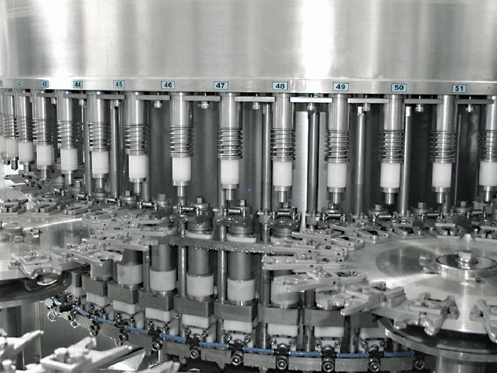 瓶子由通過風送道傳遞,然后通過撥瓶星輪傳送至三合一機的沖瓶機。沖瓶機回轉盤上裝有瓶夾,瓶夾夾住瓶口沿一導軌翻轉180°,使瓶口向下。在沖瓶機特定區域,沖瓶夾噴嘴噴出沖瓶水,對瓶子內壁進行沖洗。瓶子經沖洗、瀝干后在瓶夾夾持下沿導軌再翻轉180°,使瓶口向上。洗凈后的瓶子通過撥瓶星輪由沖瓶機導出并傳送至灌裝機。進入
