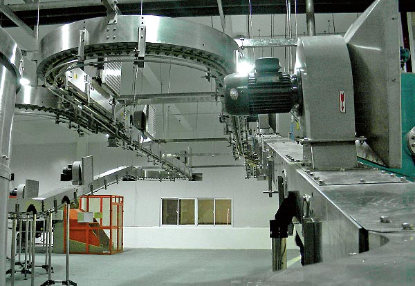 空瓶風送系統是中浩機械根據用戶廠房情況,量身定制風送、輸送系統,合理運用無壓力輸送、自動分瓶器等設備,達到生產過程中不卡瓶、不擠瓶、不倒瓶,有效提高灌裝生產線的運行效率。空瓶風送設備是使空瓶在一定壓力與速度的空氣的驅動作用下,沿著預定的軌道,有規則的風送到目的地的一種快捷、準確的輸送設備。空瓶風送系統廣泛應用在飲料行業的空瓶輸送中,輸送速/度快、效率高,可滿足高速灌裝機的需要;輸送線路長、布置形式靈活多樣,可水平輸送、上下坡輸送和轉彎輸送等;占地面積小,可充分利用廠房空間結構簡單,可靠性高,維護方便,是后包裝系統含量較高的設備之一。